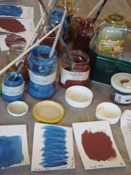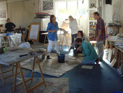 Malerinnen und Maler in allen Phasen eines offenen Malprozesses. Hierzu